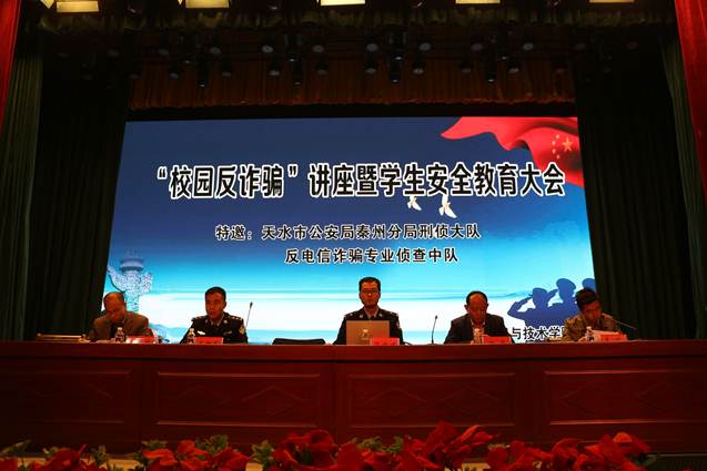 11月15日晚,人人摸人人操人人干在校文化礼堂举行“校园反诈骗”专题讲座暨学生安全教育大会。天水市公安局秦州分局刑侦大队反电信诈骗专业侦查中队陈方方、王朝东两位警官做了专题讲座,学院相关领导就政治安全、人身安全、财产安全、食品安全、实验室安全等方面做了全面讲解,并就我院安全稳定工作做了安排部署。学院党总支副书记刘正、副院长李志锋、各班班主任、全体辅导员及在校学生共计650余人参加会议。