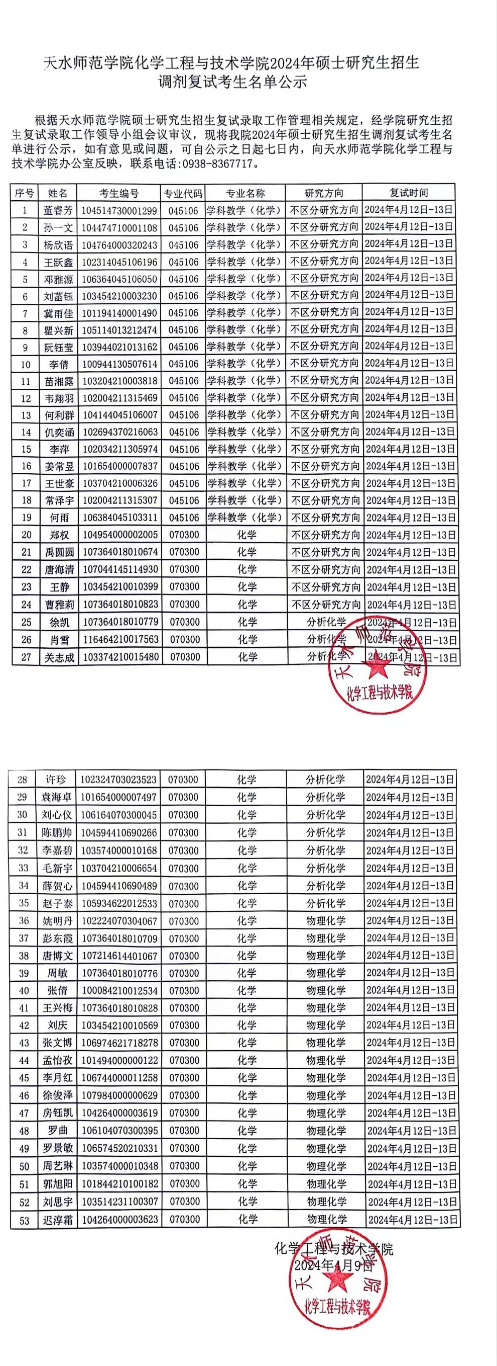 天水师范学院人人摸人人操人人干2024年硕士研究生招生调剂复试考生名单公示