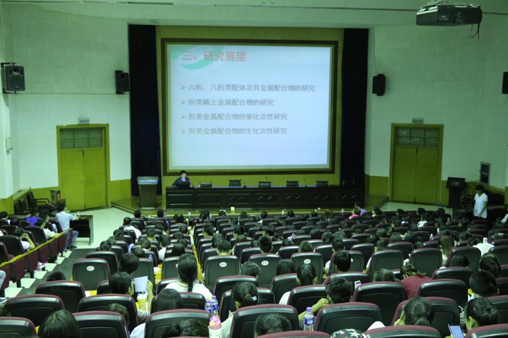 报告由化工院吕玲玲副院长主持;化工学院刘新文院长、研究生处左国防处长和化工学院部分老师,学生共计300余人聆听了报告。董教授在报告中为我院师生讲解了董教授科研团队在3d-4f多核配合物的最新研究进展及应用,董教授精彩演报告不仅赢得了同学们的阵阵掌声,也引发了同学们的无限思考,拓宽了同学们的知识面,使同学们受益匪浅,最后董教授还解答了部分老师、同学提出的问题。