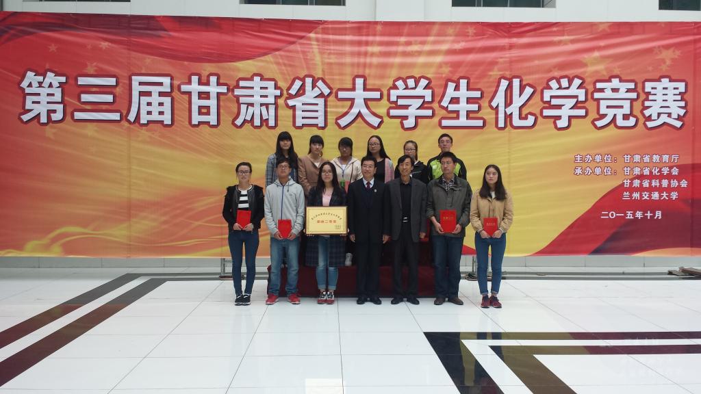 10月23—25日,由甘肃省教育厅主办,甘肃省化学会、甘肃省科普协会和兰州交通大学承办的甘肃省第三届大学生化学竞赛决赛在兰州交通大学举行。来自全省的16个本科院校的2000多学生经过初赛选拔,300名学生脱颖而出参加了在兰州交通大学举行的决赛。最终兰州大学代表队,西北师范大学代表队,天水师院代表队团体总分名列三甲。我校代表队荣获团体二等奖,何东城同学荣获个人二等奖,陈续、唐家旭、魏萍、李聪聪4名同学荣获个人三等奖,侯玲梅等5名同学获得个人优胜奖,刘岿老师分别被评为“优秀指导教师”。