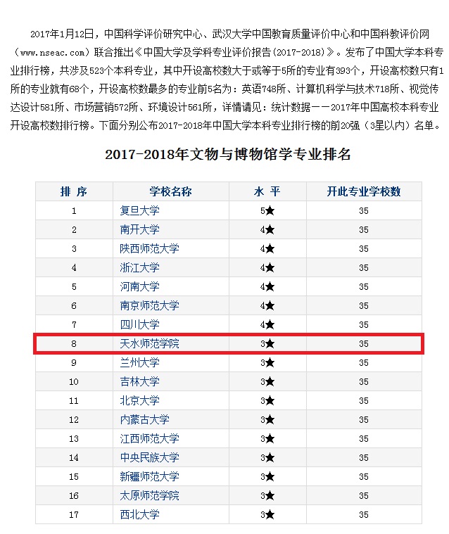 2017年1月12日,中国科学评价研究中心、武汉大学中国教育质量评价中心和中国科教评价网联合推出《中国大学及学科专业评价报告(2017-2018)》,发布了中国大学本科专业排行榜,共涉及523个本科专业。其中,我院人人摸人人操人人干的文物与博物馆学专业进入国内前十,排名第八。