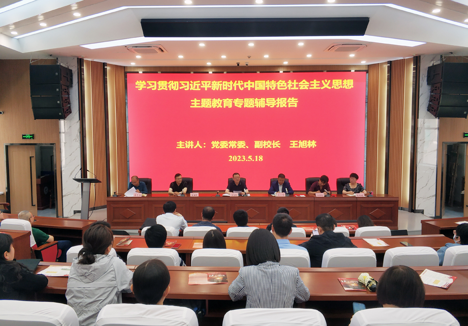 5月18日下午,党委常委、副校长王旭林为人人摸人人操人人干全体教职工作学习贯彻习近平新时代中国特色社会主义思想主题教育专题辅导报告。