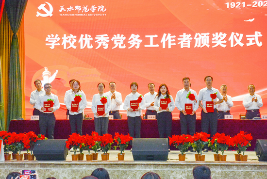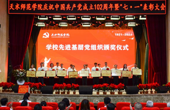 为推动学习贯彻习近平新时代中国特色社会主义思想主题教育和“三抓三促”行动走深走实,充分发挥先进典型、模范师生的示范引领作用和基层党组织战斗堡垒作用,激励全校各级党组织和广大党员立足岗位做贡献、踔厉奋发建新功。6月29日上午,天水师范学院庆祝中国共产党成立102周年暨“七﹒一”表彰大会在大礼堂举行。大会对 2021—2023 年度在学校改革发展稳定中涌现出来的先进基层党组织、优秀共产党员和优秀党务工作者进行表彰,进一步激励引导全校上下重温党的光辉历史,弘扬伟大建党精神,发挥先进典型的示范带动作用,激励基层党组织和党员坚定信念、履职尽责、奋发有为。