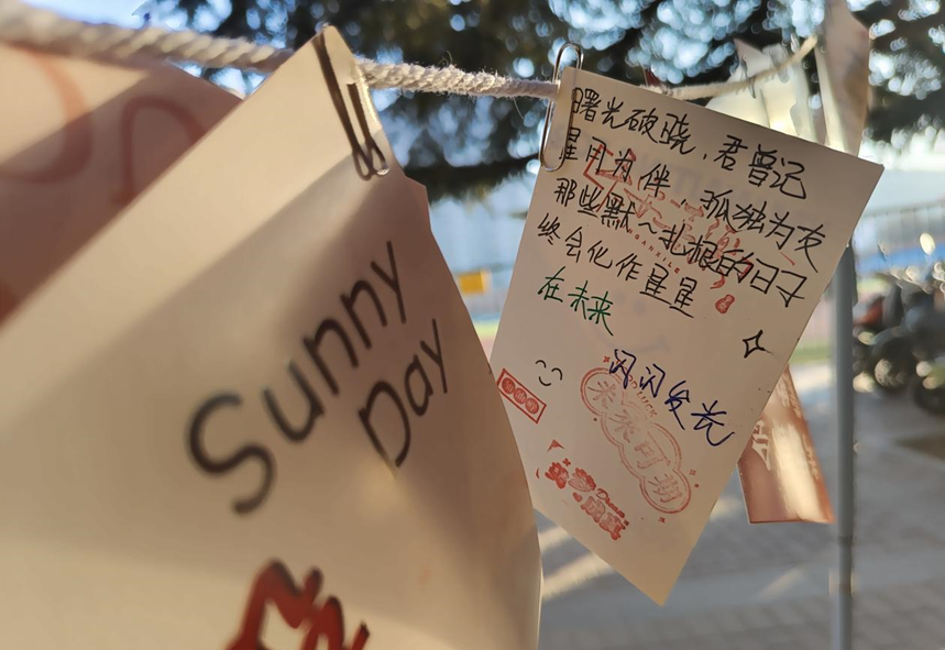 “我是向你传递祝福的手写贺卡,以最真挚的寄语相赠。我是寒夜为你递上暖贴的双手,以一点温暖点燃你的梦想。愿你在广袤的知识沃土间俯首躬耕,愿你如朝气蓬勃的金葵般向阳而生,愿你有璀璨的星光做照亮前路的灯,愿你永怀热血赤诚不断朝高处攀登,愿你在追逐梦想的道路上持之以恒。惟愿各位考研学子青云万里,终将上岸。”一张张带着美好祝愿的明信片、承载着真挚寄语的便利贴在冬日的校园里随风摇曳,希望能在这个寒冷的冬日给广大考研学子送去一份份温暖和鼓励。