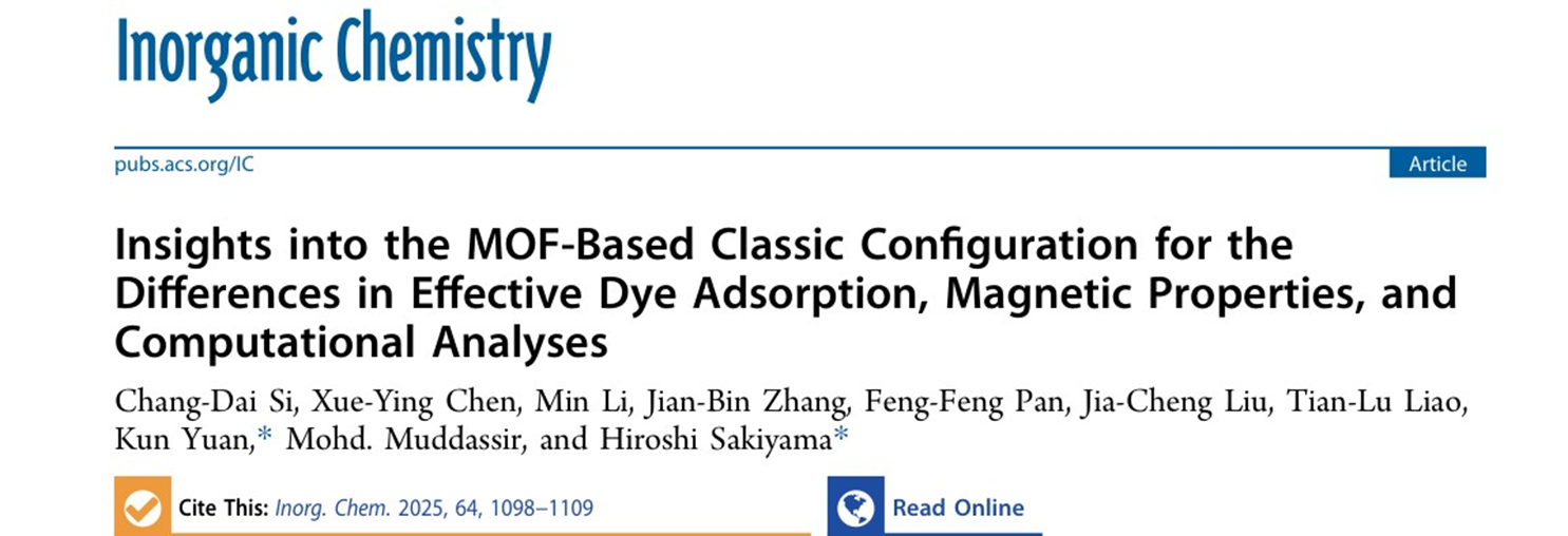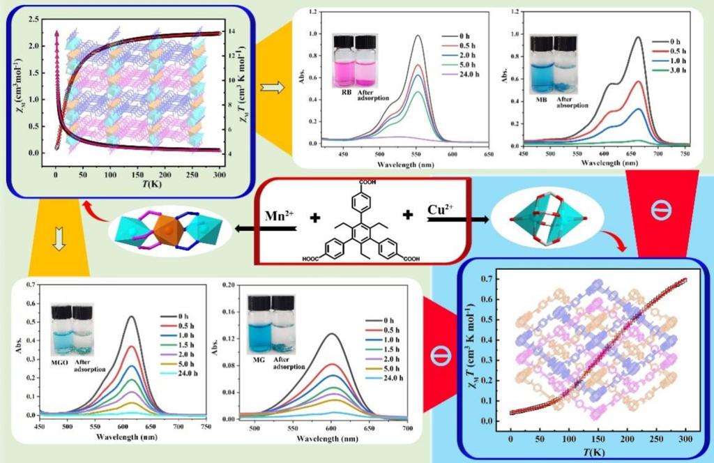 近日,人人摸人人操人人干教师司长代教授在自然指数期刊《Inorganic Chemistry》发表题为“Insights into the MOF-Based Classic Configuration for the Differences in Effective Dye Adsorption, Magnetic Properties, and Computational Analyses”研究论文(doi.org/10.1021/acs.inorgchem.4c04705),我校2023级物理化学专业硕士研究生陈雪莹为第二作者,袁琨教授和日本山形大学的Hiroshi Sakiyama教授为通讯作者。金属有机框架(MOF)具有多种与结构相关的特性,如染料吸附和降解、磁性、气体吸附与分离以及多相催化等,近年来受到了广泛的关注。本论文主要对溶剂热合成的MOFs进行了紫外-可见光谱分析、ζ电位测定、有效孔径测定、透射电子显微镜(TEM)和扫描电子显微镜(SEM)表征以及密度泛函理论计算等,用以研究Cu-MOF和Mn-MOF的准确吸附位点以及染料吸附差异和磁性。结果表明Mn-MOF对阳离子染料(罗丹明B、甲基蓝、孔雀绿和甲基绿)表现出显著的吸附性能,去除率分别达到95.2%、95.0%、87.0%和78.0%,而对于阴离子染料(甲酚红和甲基橙)几乎没有检测到吸附。然而,对于Cu-MOF,未能有效吸附选定的任何染料。此外,实验和理论计算详细研究了MOFs磁性,揭示了Cu(II)和Mn(II)中心之间的反铁磁相互作用及磁交换机理。这项工作也为多功能MOFs合成和性质研究提供思路和理论基础。